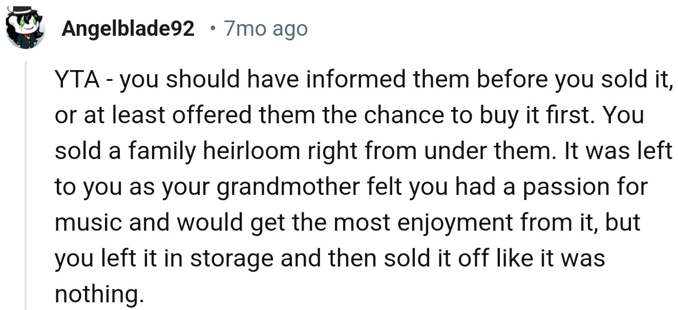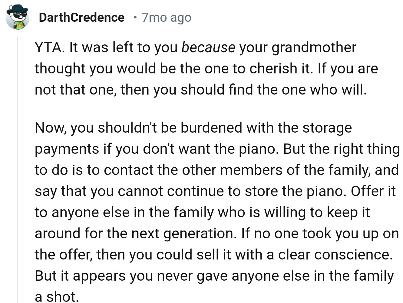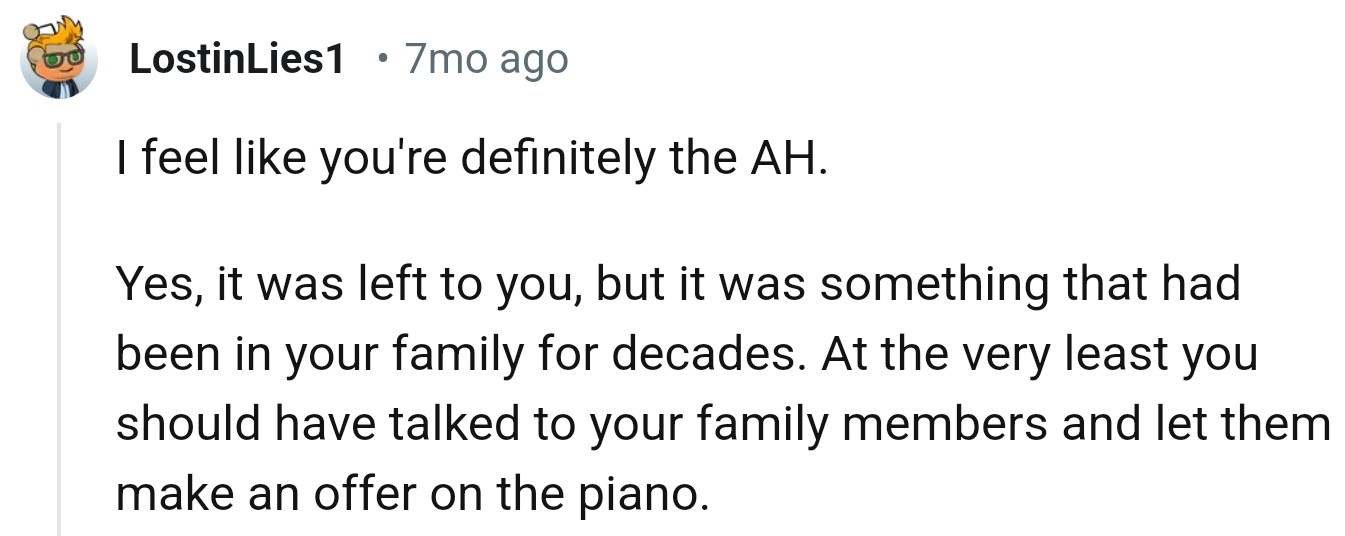 To them, the piano was a priceless relic meant to be passed down through generations. They argued that its sentimental value far exceeded any financial benefits, and they were outraged that OP would even consider selling such a thing.