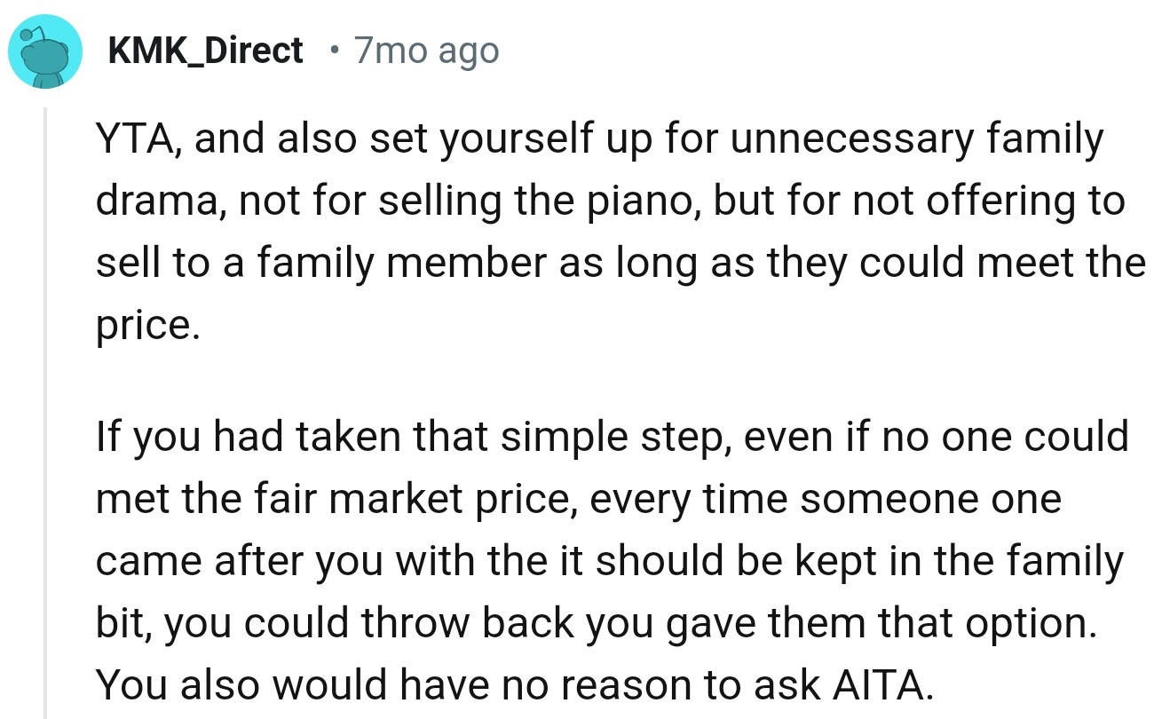 "Set yourself up for unnecessary family drama, not for selling the piano"