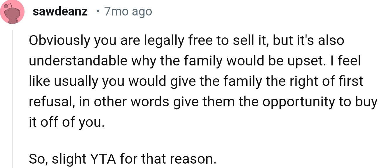 "You are legally free to sell it, but it's also understandable why the family would be upset"