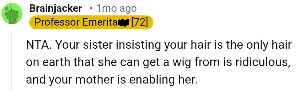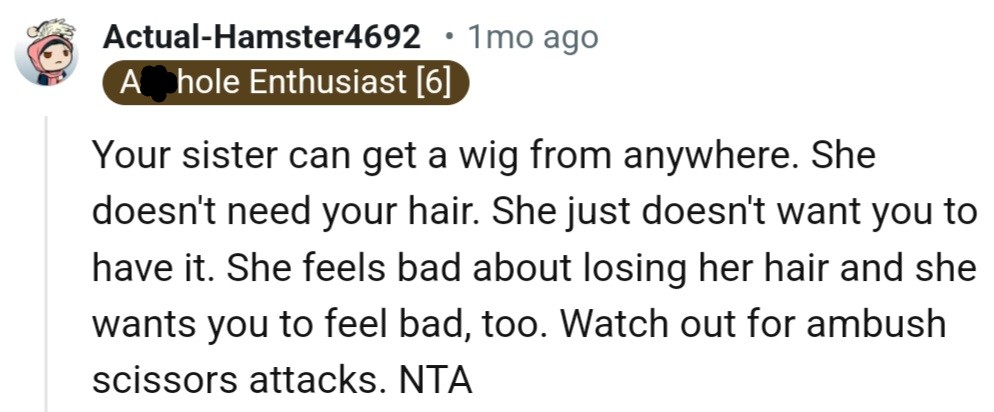 "Your sister insisting your hair is the only hair on earth that she can get a wig from is ridiculous"