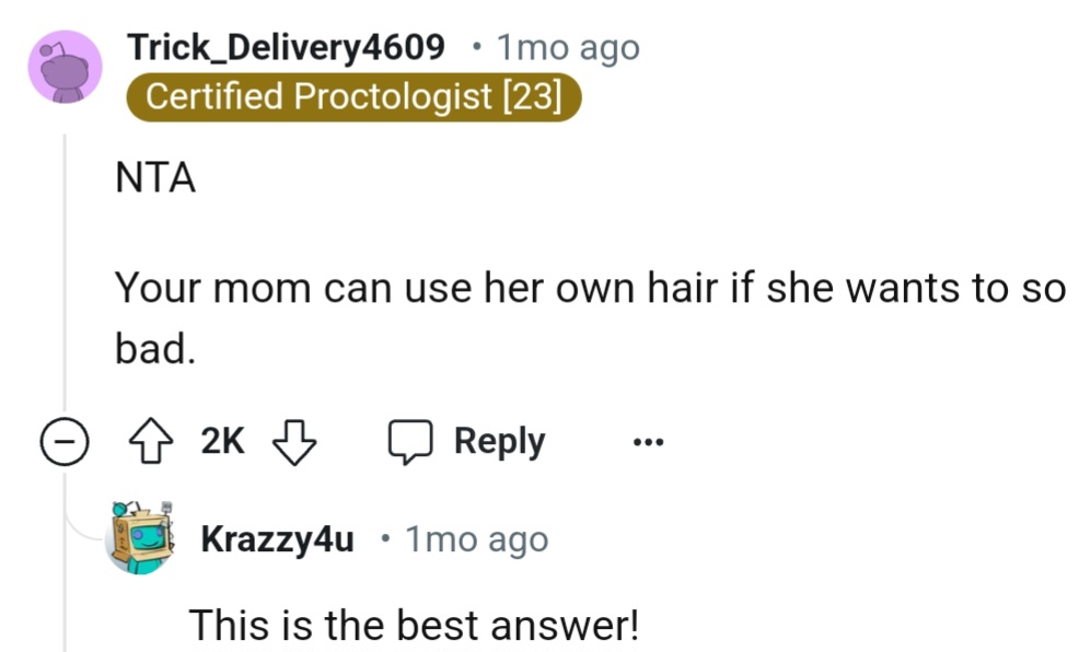 In an effort to comfort her, OP's mom suggested that she shave off her long hair to make a wig for their sister.