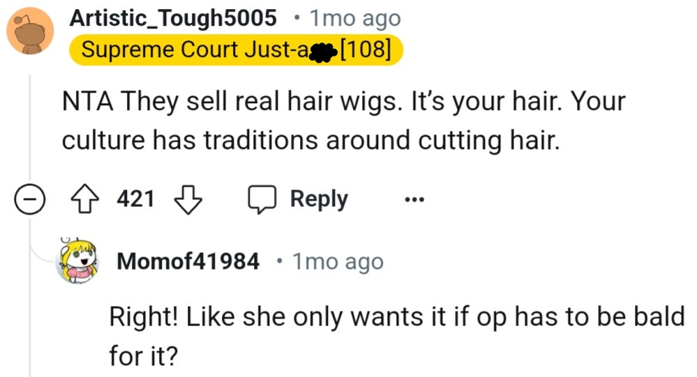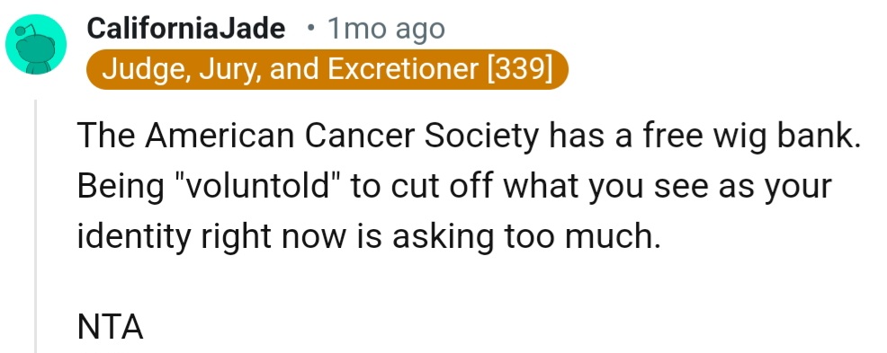 Imagine growing your hair for years, nurturing every inch with love and care, only to be asked to shave it all off. That was the predicament our narrator (Original Poster) found herself in.
