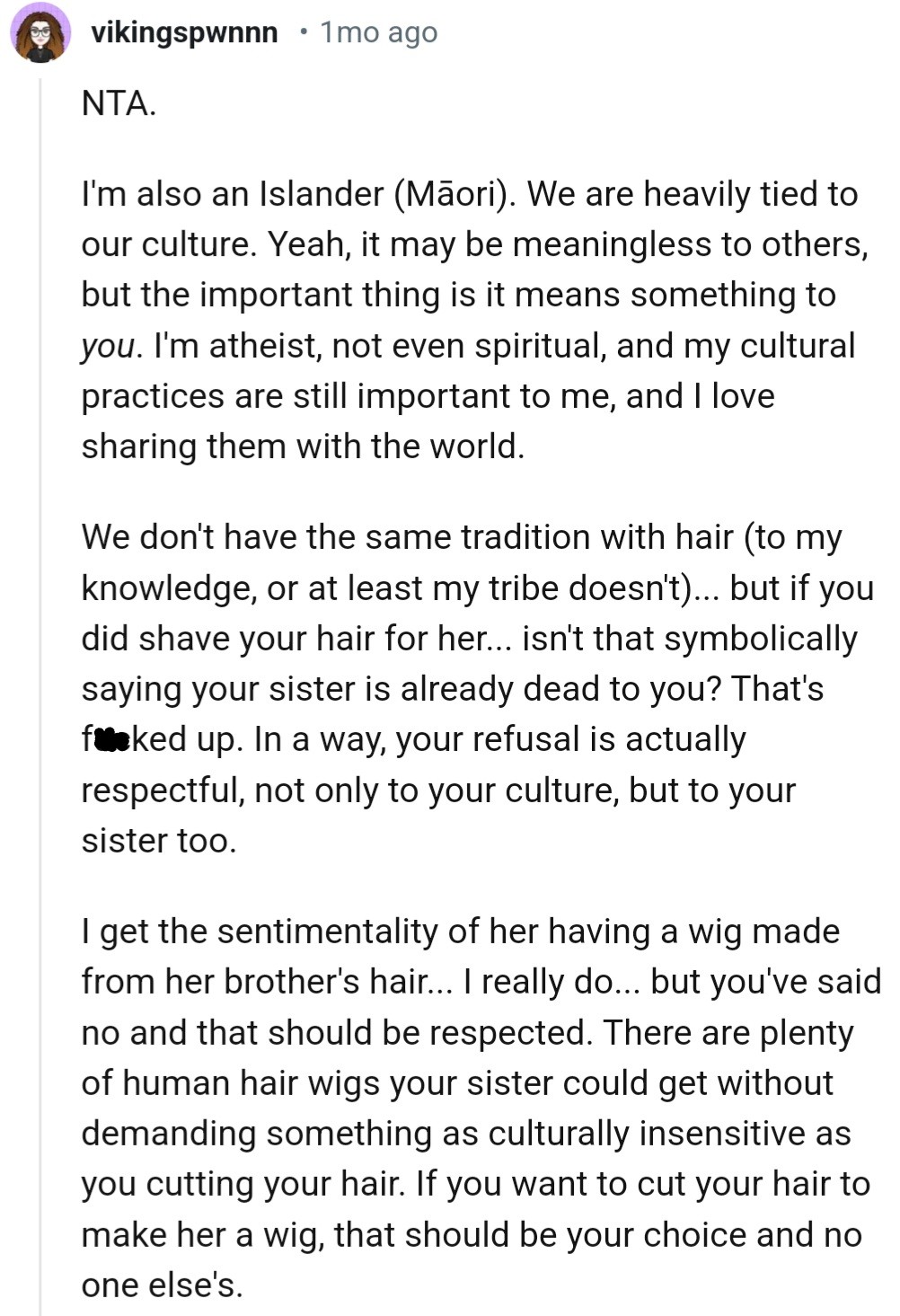 While it may seem like a simple matter of snipping some hair, for OP, it represents so much more—a connection to her heritage, her father, and her self-identity.