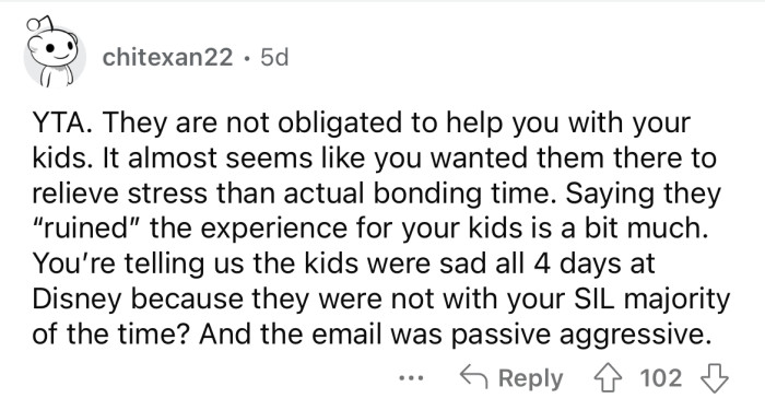 Reddit/Final-Sheepherder-17The OP invited her SIL on a trip to Disneyland with their kids and "assumed" they would spend all of their time together.