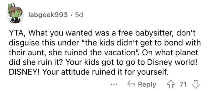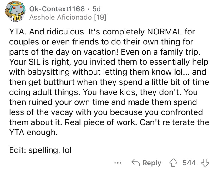 The OP told her SIL that they "could use the help" running around after the kids at the amusement parks. But the OP's SIL said she didn't take time off work to come away and be their babysitter.