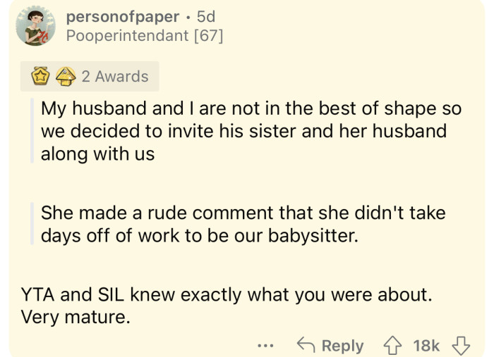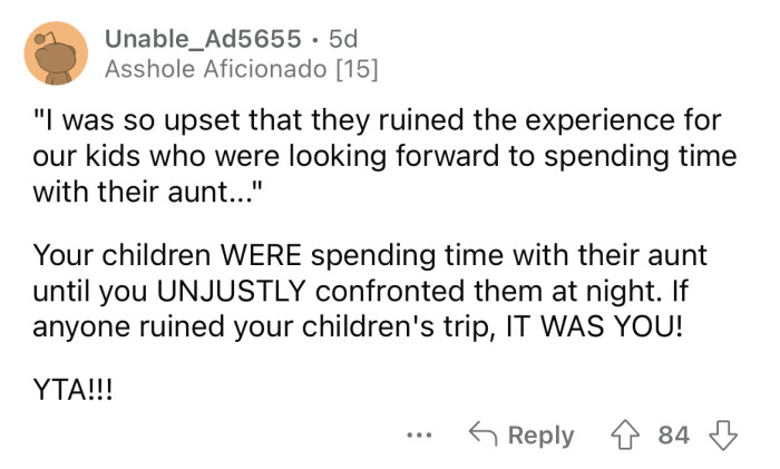 Reddit/Final-Sheepherder-17The OP was upset that on one of the days, her SIL and her husband were "clearly very tipsy" in front of the kids.