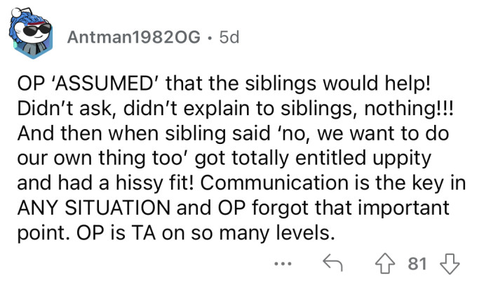 But what happens when you assume that said family members will be there to help you, only to find out they just want to do their own thing? Well, that's exactly what Reddit user u/Final-Sheepherder-17 posted about in the AITA (Am I The A**hole?) subreddit recently.