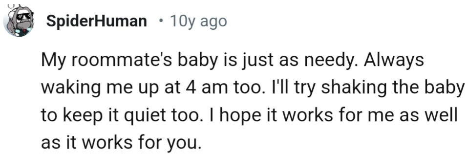 "My roommate's baby is just as needy. Always waking me up at 4 AM."