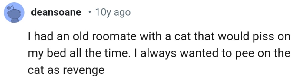 "I had an old roommate with a cat that would piss on my bed all the time."