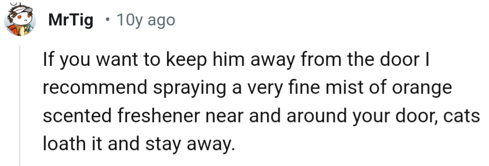 "If you want to keep him away from the door, I recommend spraying a very fine mist of orange-scented freshener"