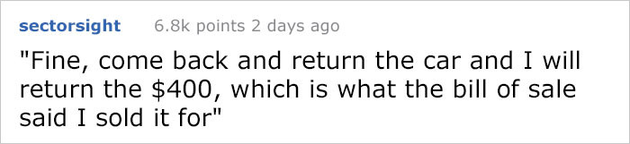 After selling his car to a 21-year-old "kid" for $4,000, both parties parted happily after their transaction. However, the buyer's mother went off the deep end, messaging /u/MetalM1ke and literally demanding he return $3,600! You can't make this stuff up.