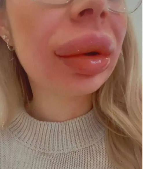 A 24-year-old woman experiences a severe reaction, leaving her 'gasping for air' and with a 'balloon face and no eyes' following the dissolution of lip filler.