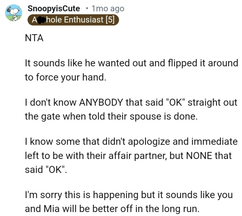 "I'm sorry this is happening, but it sounds like you and Mia will be better off in the long run"