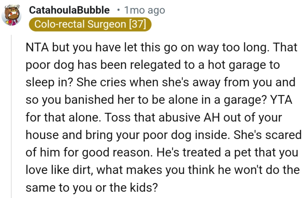 "Toss that abusive AH out of your house and bring your poor dog inside"