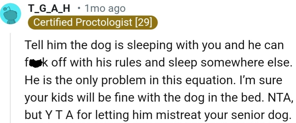 "Tell him the dog is sleeping with you and he can f*ck off with his rules"