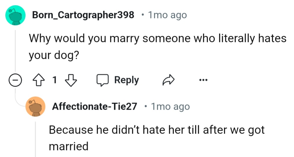 "Why would you marry someone who literally hates your dog?"