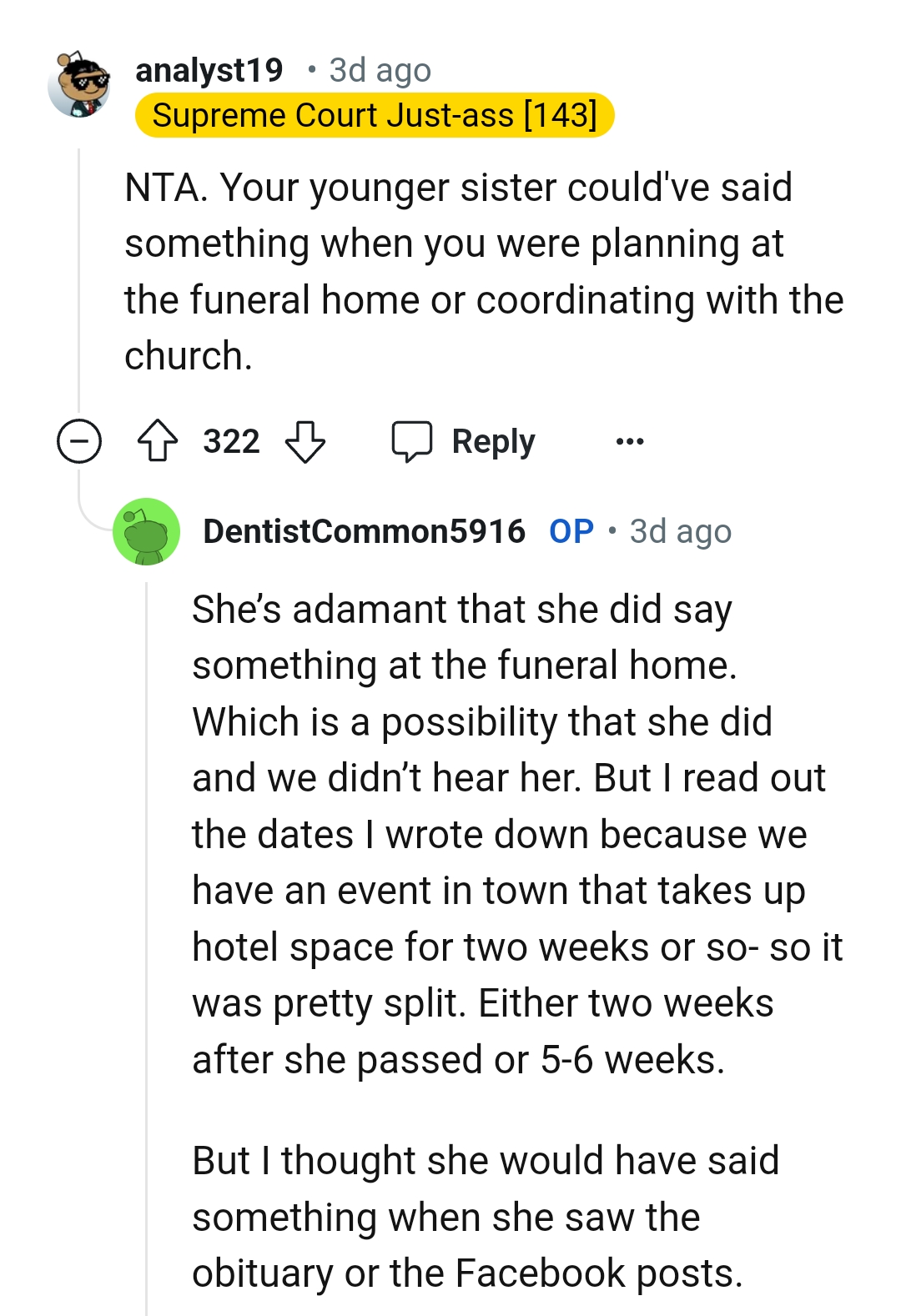 I scheduled my mom’s funeral on a day my sister had a concert to attend. I could have rescheduled the funeral when no one had any plans a few weeks later, so I might be the asshole for not rescheduling when she did say she couldn’t make it.Below are some of the most upvoted comments from other Redditors for you to read through