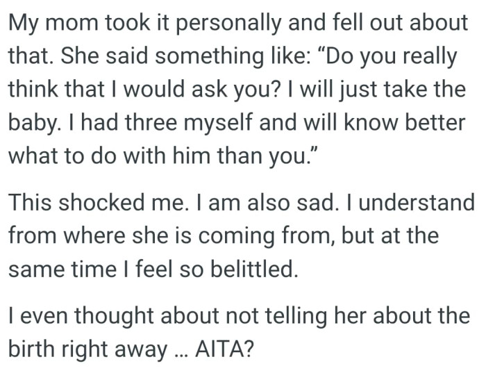 The situation has left OP feeling belittled and sad, because she must consider her own needs and her baba's while also trying to understand her mom's perspective. This story is revealing the details of mother and daughter relationships and the challenges of becoming a new mother.