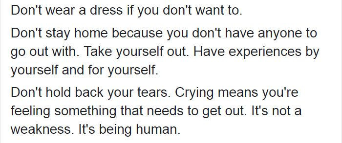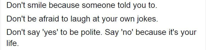 For all of those little people out there just beginning to learn about the big, bad world, it can be overwhelming and scary. Perhaps that's why this post has become so incredibly popular. Simple things like "Don't smile because someone told you to" or "Don't wear a dress if you don't want to" can mean so much to a young girl who is feeling pressured to be anything but herself.