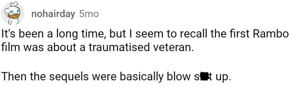 "I seem to recall the first Rambo film was about a traumatized veteran."