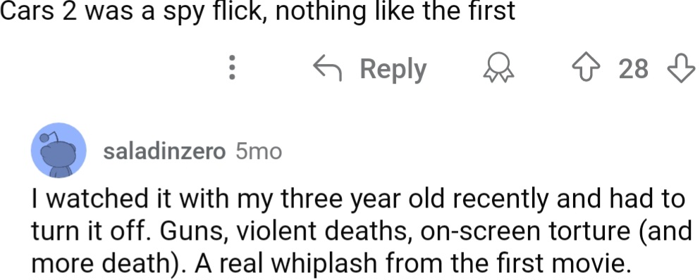 And who could forget "Cars?" A charming, heartwarming tale for all ages. The sequel, however, was a spy flick filled with guns, violent deaths, and on-screen torture—quite the departure that left many viewers, especially the younger ones, quite perplexed.