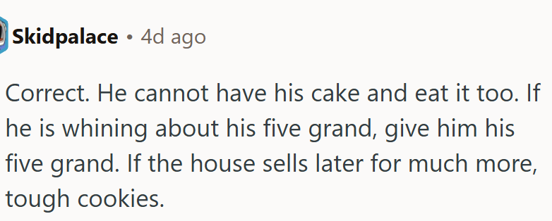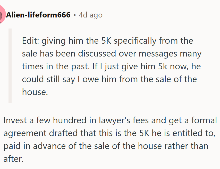 Commenters largely supported her stance. They encouraged her to separate two issues. First, honor the five-thousand obligation in a clean, enforceable way.