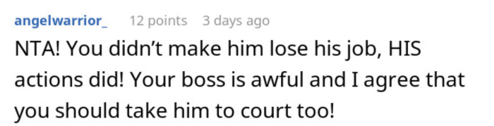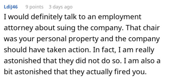 I got a new job in sales working for a company that sells access control systems, CCTV systems, etc. The chair in my cubicle was uncomfortable AF, so I day 3 I brought in my own Herman Miller Aeron chair. On day 4 it was missing. I looked around and another sales rep was sitting in it. I asked for it back but he basically told me to F off.I went and spoke to the owner of the company. He told me that the chairs aren't reserved. They are first come first serve. I explained that I OWN the chair and it cost me $1800. He told me that I need to come in earlier if I want that chair.The next day the same guy was sitting in it when I got to the office. I told him to give it back or I was going to call the cops. He refused. So I called the cops.It was quite the scene, but in the end he admitted that he took my EIGHTEEN HUNDRED DOLLAR chair. I was prepared. I had the receipt which showed the serial number. (Yes, Aeron chairs have serial numbers.) They asked me if I wanted to press charges. My new boss said I would be terminated if I had him arrested, so I said "Absolutely! I want to press charges!"My new boss fired me on the spot, so I carried my chair out with me a I was leaving. And yes, the cops arrested the dude who took my chair (He admitted to it!).The dude who took my chair has been in the industry for about 15 years, but he's going to lose his security license, which means he won't be able to work in the industry. He's going to lose his job. I don't give a shit. He shouldn't have stolen my chair.Am I the asshole for making this dude lose his job?Here's how the Reddit community reacted.