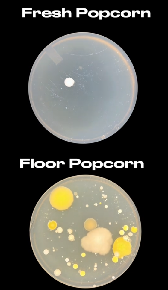 At the heart of this exploration was a simple yet eye-opening experiment. Tim collected samples of freshly served popcorn and those that had found their way to the floor. Back in the lab, these samples were introduced to petri dishes and left to reveal their secrets under the watchful eye of an incubator.