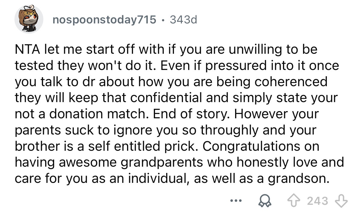 When my brother (18m) was 4 and I (16m) was 2 he was diagnosed with a blood cancer. He'd been sick for a little while and our parents thought he had a flu or something so they didn't get him all the help right away and because of that guilt they devoted every second to him from that point forward. It was supposed to be until he was cancer free. But by the time he was, we were 8 and 6 and they had become so used to focusing on him alone. I spent most of my time with an uncle who lived nearby or neighbors when he was undergoing treatment. My uncle didn't like having me nearby and the neighbors were so busy with their own kids that I got pretty used to being ignored and forgotten. So when my brother was back home and I wasn't sent anywhere anymore I was more used to being alone somewhere and taking care of myself. My relationship with my parents was never a close one and it's the same with my brother. Both of us feel more like only kids and he gave me shit before for telling our parents I'd like some of their attention too. They'd always tell me he needed it more and he considered me a drama queen. The last time I said anything which was like 3 years ago, he said he didn't realize boys could be as dramatic as girls. My brother's cancer come back 5 years ago and it was dealt with early and he didn't have treatment for very long and after that he seemed better in all ways. He had more energy, appetite was better and he was doing stuff he'd never had the energy to do before. About a year ago my mom's parents moved closer to us and they spent time focused on me which bonded me to them pretty quickly. I spend a lot of time with them now. I also took my focus totally off my parents and wanting their attention. In July my brother's cancer returned again but it's different this time. I wasn't given much info. Treatments are complicated I guess and some other countries have treatments we're not focused on yet so there's talk of him going to Germany and I think Switzerland (but I could be wrong since I don't get much info). My parents are working more hours to help pay for this. And since then I spend even more time with my grandparents. Sometimes spending the night with them. My lack of presence wasn't noticed until they wanted me to help raise the money and maybe offer to get tested if that's what's needed. They said I could start fundraisers and get a job. I already have one but my parents never noticed. I told them I wasn't going to help with that and it was for the three of them to figure it out. I got yelled at and my grandparents stepped in and said I wasn't responsible for this. My parents were saying it was helping family, my own brother and how could I consider not doing everything to help. AITA?Here's how the Reddit community reacted.