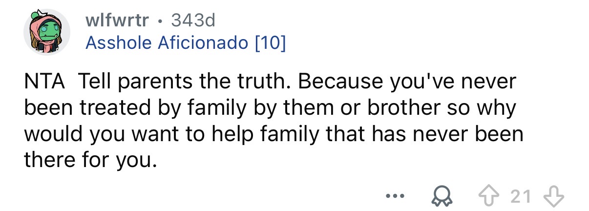 The fallout was immediate. His parents accused him of being selfish and heartless, saying that family helps family no matter what.
