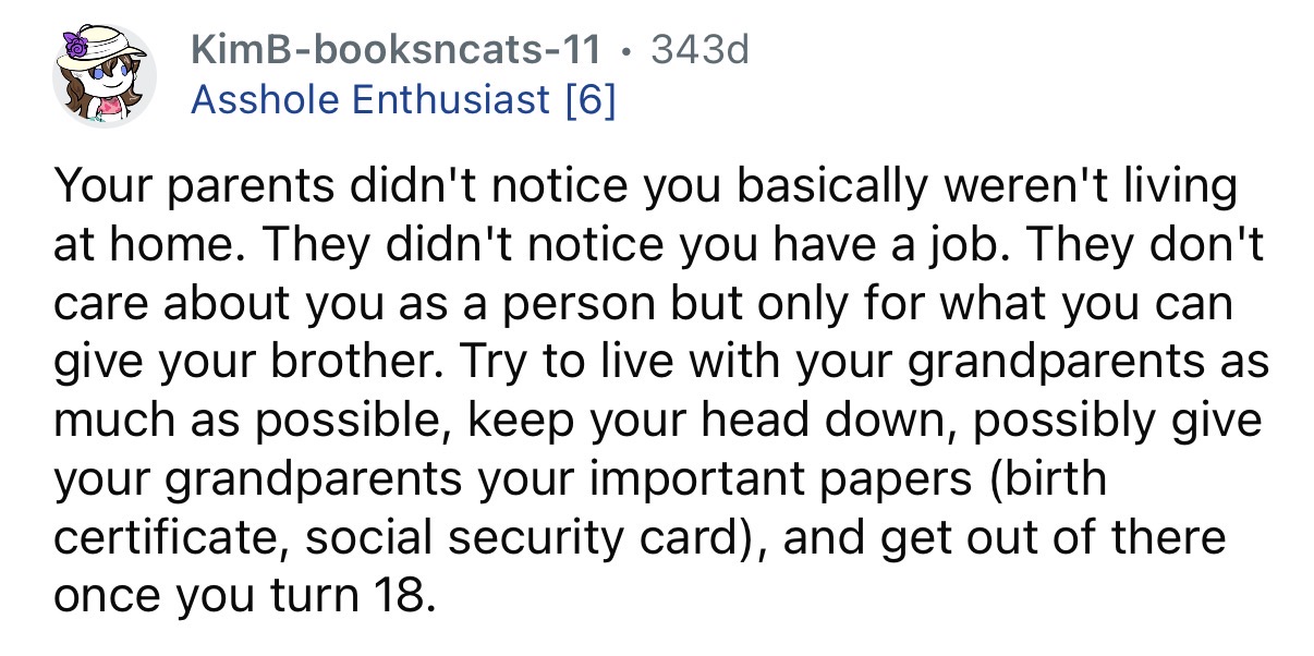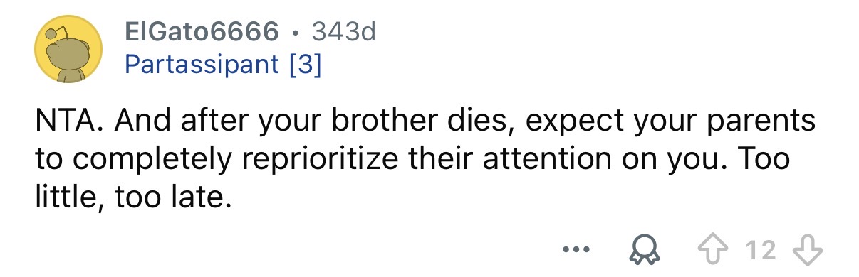 He started his post by explaining how his older brother was diagnosed with blood cancer at just four years old. Their parents, overwhelmed with guilt for not catching it sooner, threw every ounce of time, energy, and attention into their sick child — leaving their younger son, the Redditor, in the shadows.