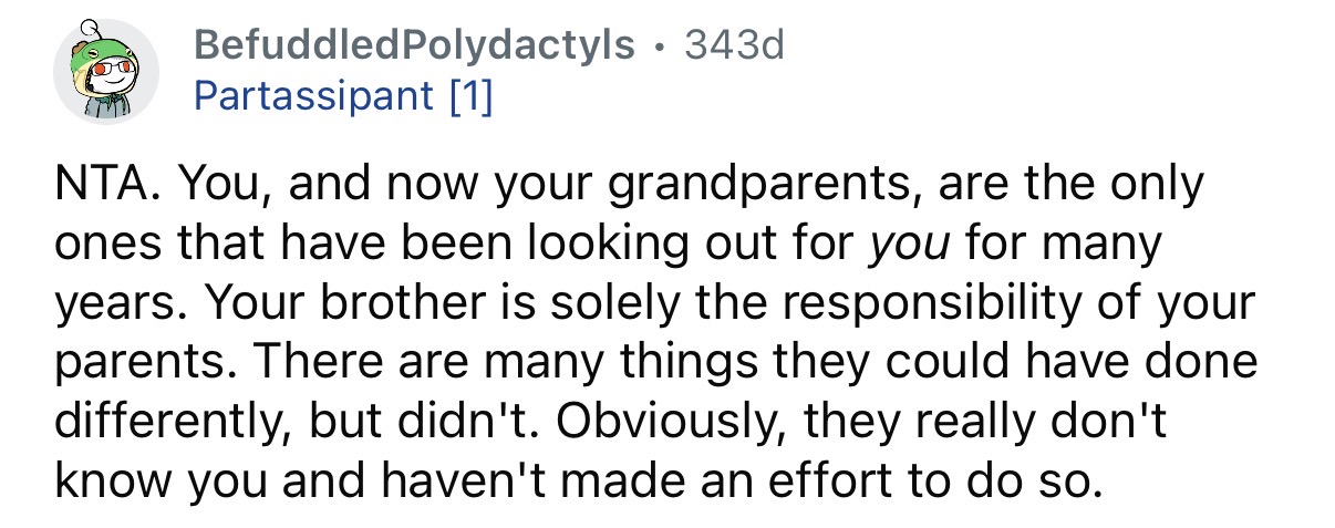 Thankfully, his grandparents stepped in and defended him, reminding his parents that he wasn’t responsible for their choices or their guilt. Still, his parents couldn’t see it that way — and now he’s questioning whether he did the right thing.
