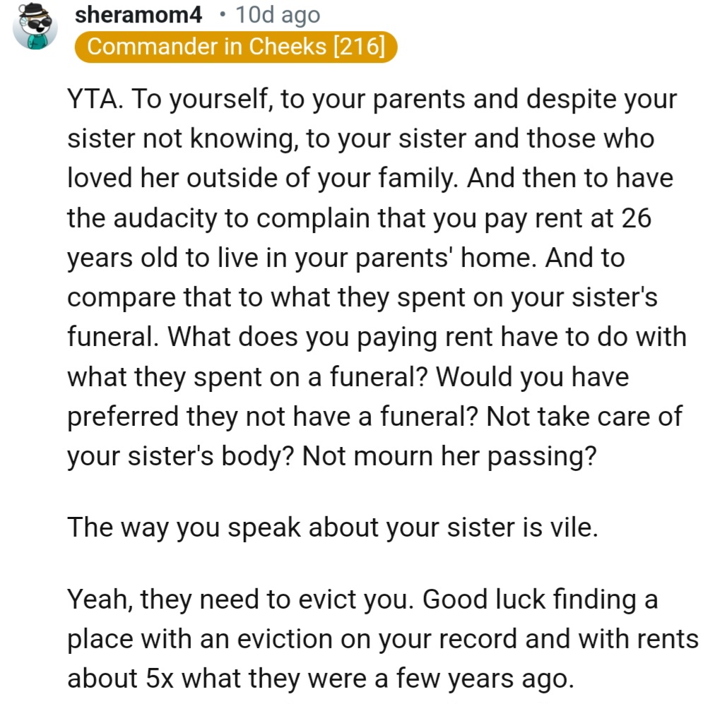 The funeral was no different. It was a grand affair with expenses so steep that OP was now expected to pay rent to cushion the financial blow.