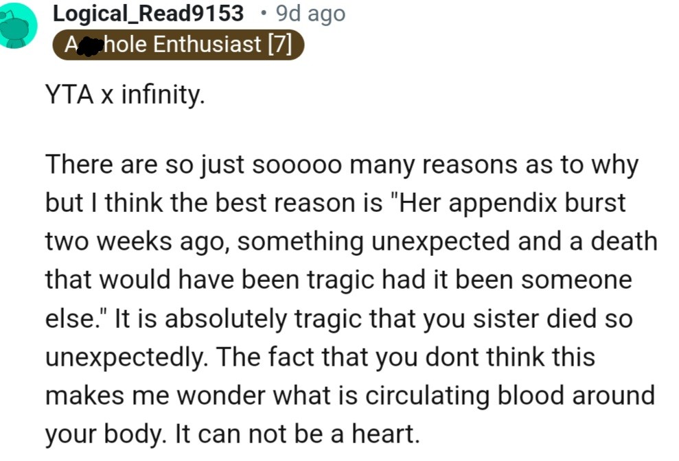 Our narrator (Original Poster) lost her sister suddenly just two weeks ago. The sister in question wasn’t just anyone; she was the golden child, the family’s shining star, whose untimely demise following a burst appendix left everyone shattered—everyone, that is, except OP.