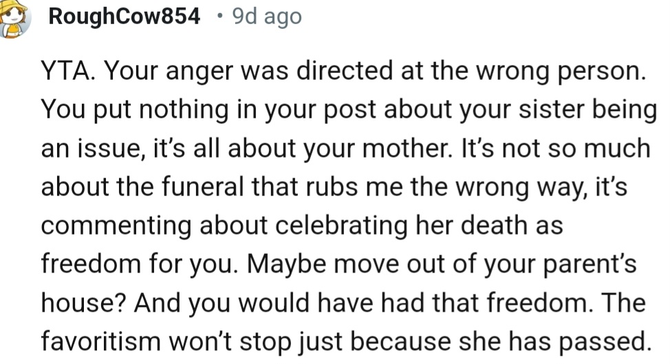 The Redditors gave a strong YTA. They urged OP to redirect her anger from her deceased sister to the true architect of their rivalry—her mother.