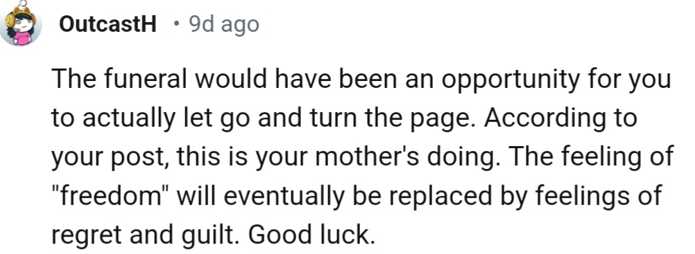 Many pointed out that the funeral could’ve been a milestone for letting go, not just a sorrowful gathering. As the debate stirred, suggestions poured in advocating therapy and personal growth.