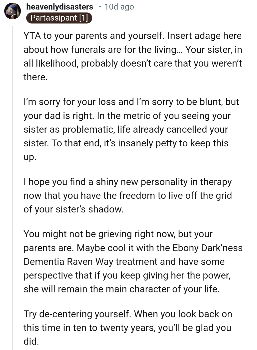 Would the same grandeur have graced her own funeral? OP strongly doubted it. If she were being completely honest, she felt relieved that she no longer had to live in her sister’s shadow.