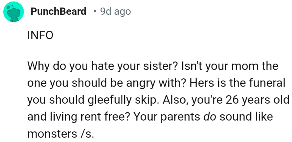 However, OP's Mom Created Tension Between Her and Her Sister, Making OP Feel No Need to Grieve Her Sister's Death. Now, OP's Dad Is Threatening to Kick Her Out of the House for Skipping the Funeral, but OP Believes She Was Right to Prioritize Her Own Peace.