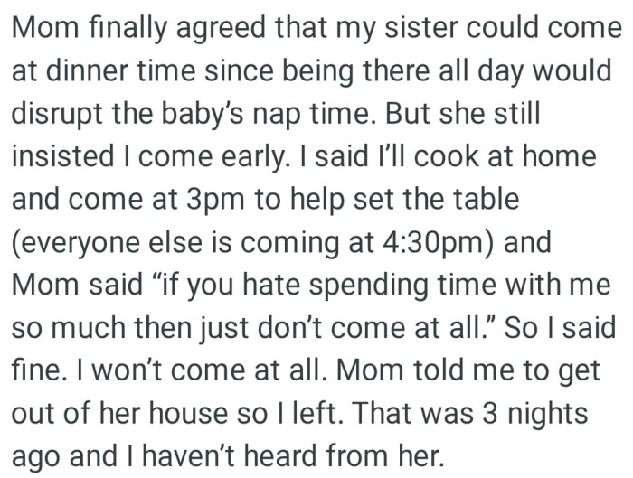 The situation escalated, and OP ended up saying she wouldn't attend the family gathering at all. With hurt feelings and unmet expectations on both sides, OP's mother sent her away with her words.