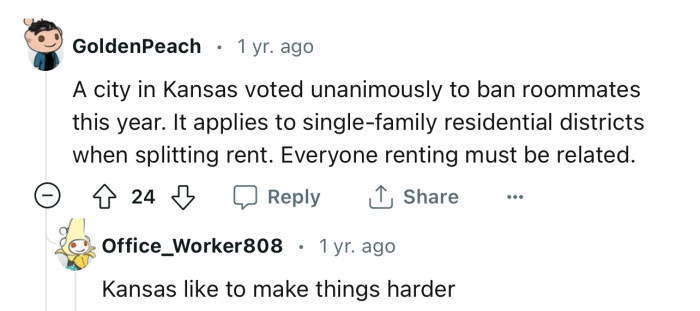 "A city in Kansas voted unanimously to ban roommates." — You can’t rent with another person(s) unless you are related
