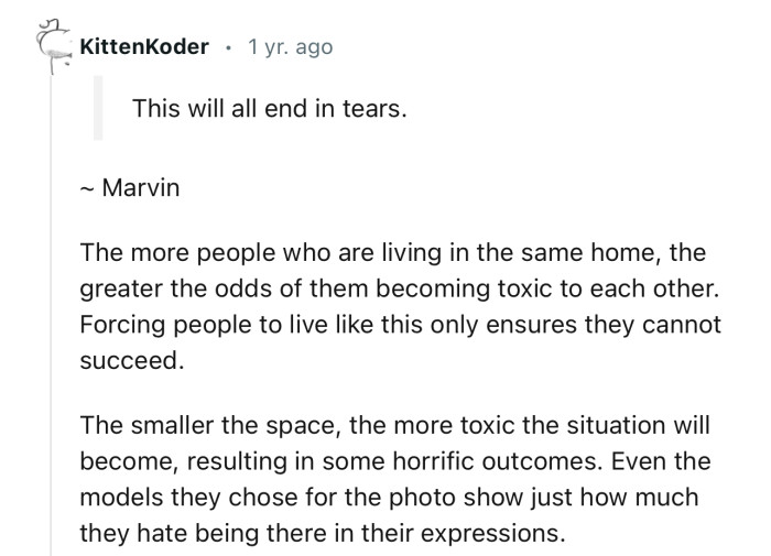 One Redditor also pointed out that it would have been ideal for the author to challenge the high cost of housing rather than tell people to gather more strangers to share the cost.