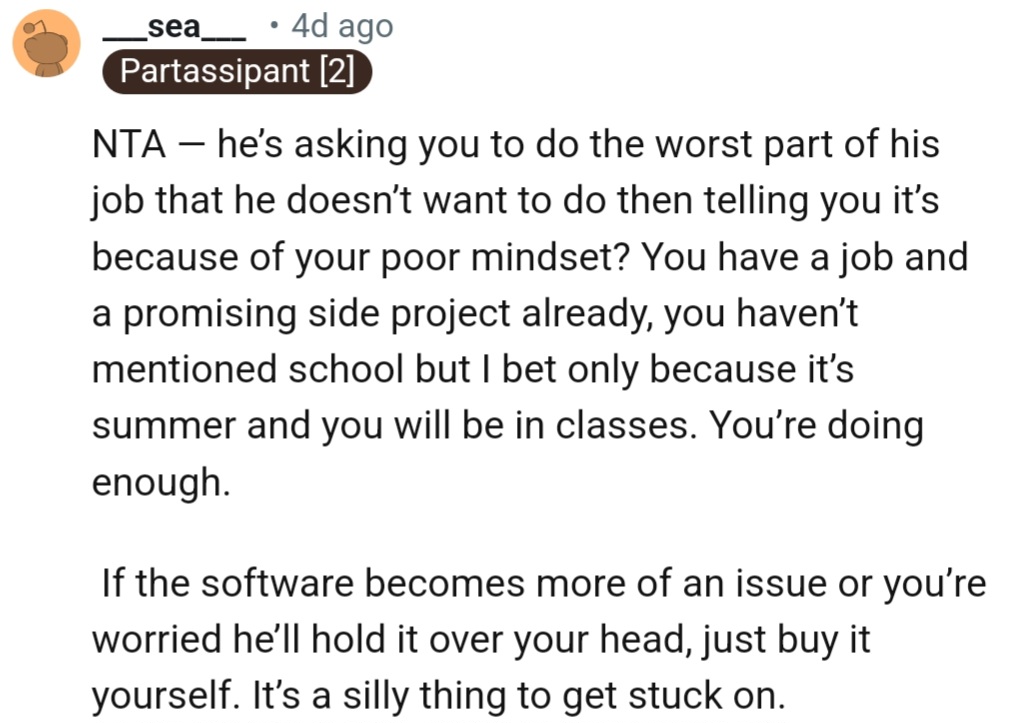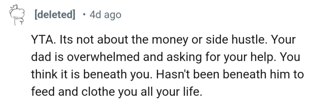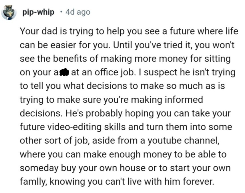 The short summary was that he was simply not interested. OP’s dad didn’t take it well. “You’ve got a lousy mentality,” Dad said, calling OP spoiled and insisting he needed to start making adult decisions about money.