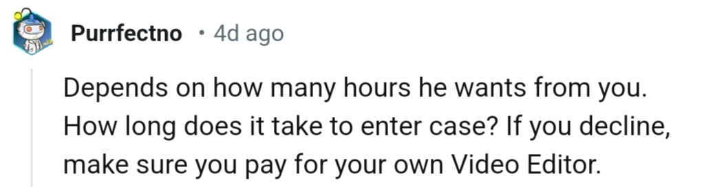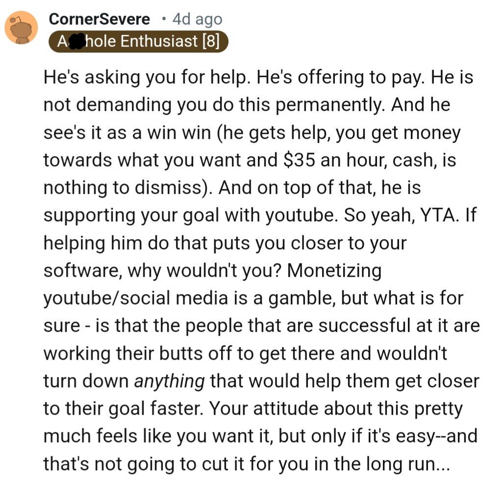 Dad even sweetened the pot: OP could rake in $35 an hour for two hours of mind-numbing data work. And hey, that money could go straight to the Adobe editor fund.