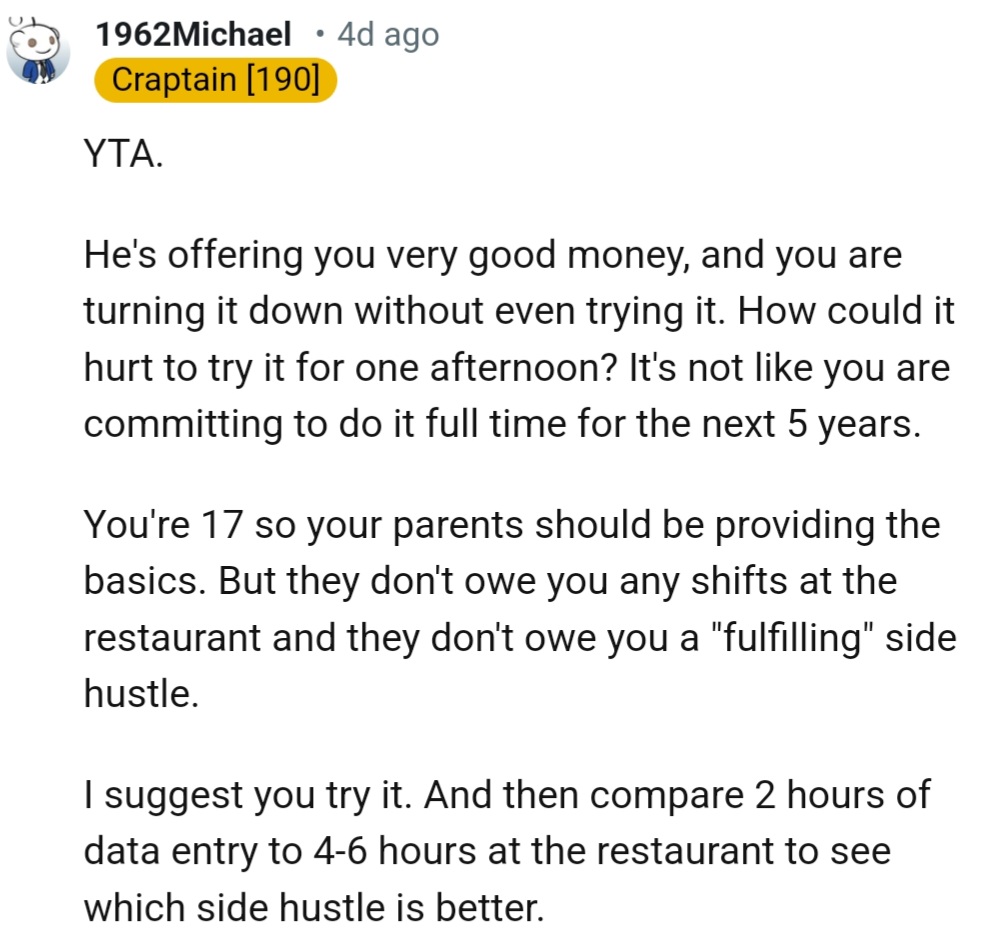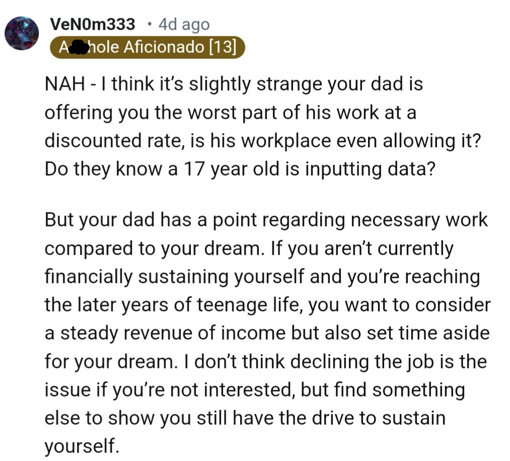 However, OP's dad labels him spoiled for declining a data entry job. He insists OP needs to focus on making money as an adult, but OP views it as an unappealing side hustle.