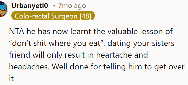 Although this was a challenging situation, Redditors told the OP that she was not in the wrong and that she handled the situation very well. This experience will serve the OP's son as a valuable lesson to learn that dating his sister's friends is not a good option.