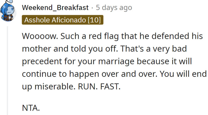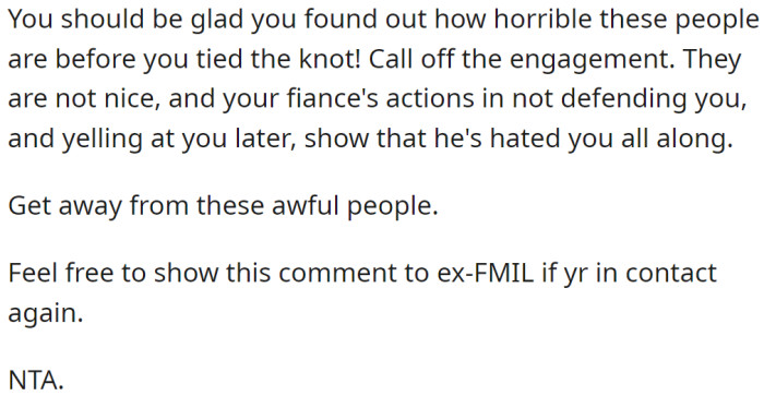 Redditors also advised her to reconsider her engagement because her fiance's behavior wasn't appropriate either. He had allowed his mother to humiliate her in front of the entire family, and he was not even aware of that fact.