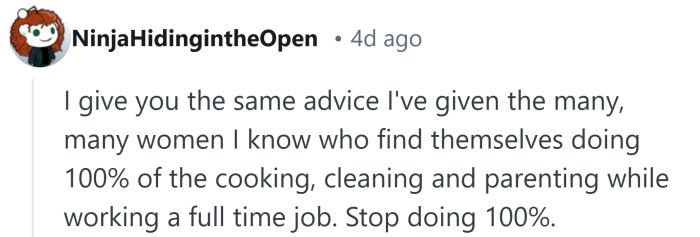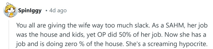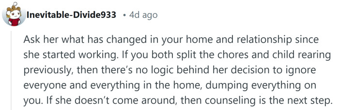 But when she recently started her first full-time job, everything shifted. Just two months in, she stopped doing any household tasks altogether. The OP suddenly found himself responsible for cleaning, laundry, shopping, dishes, meals, and childcare—on top of working full-time himself.