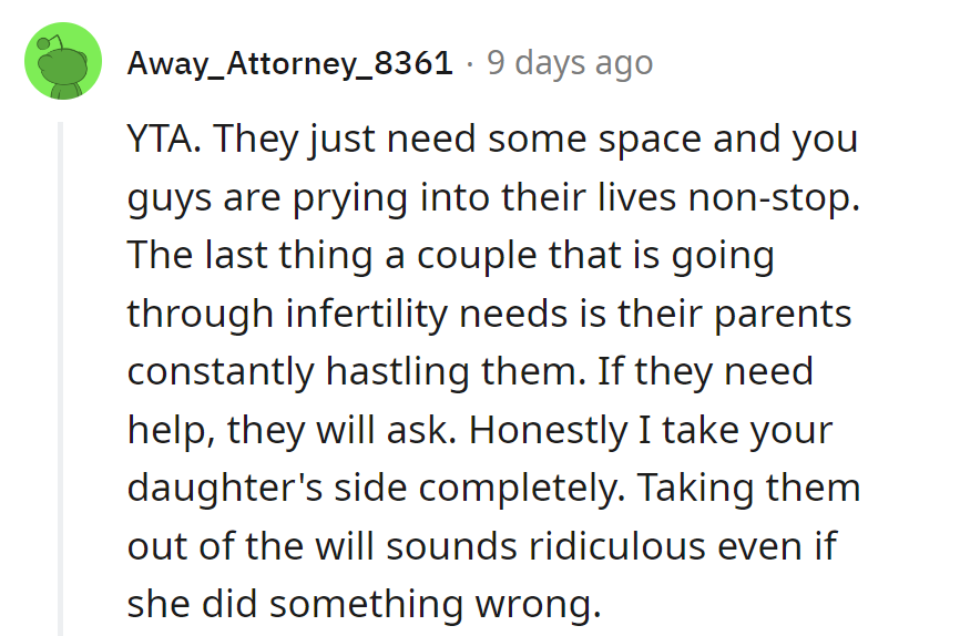 "The last thing a couple that is going through infertility needs is their parents constantly hassling them."