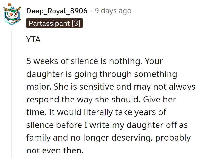 Maggie hasn't spoken to her family in 5 weeks. OP considers cutting her from the will, but Angela wants to give her time.
