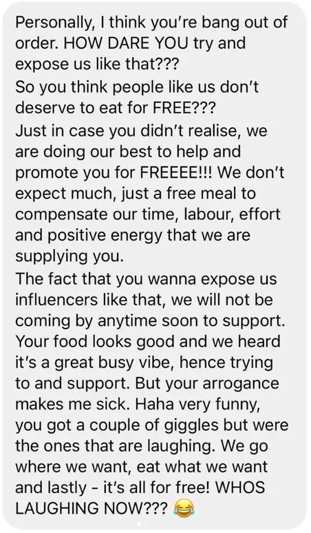 It all began when an influencer slid into the restaurant's DMs, casually asking for a free brunch in exchange for social media exposure.